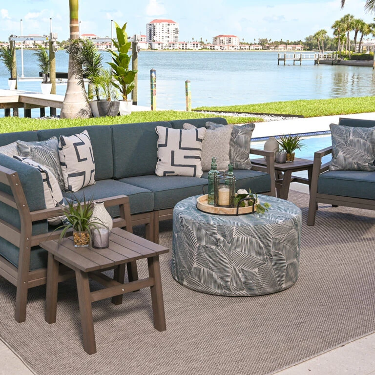 Upgrade your outdoor space with this handcrafted 32″ round pouf—perfect as a footrest, side table, or extra seat! Built to withstand sun, rain, and salty breezes, it blends durability with modern comfort. Order now to enjoy limited-time savings on this made-to-order outdoor essential!