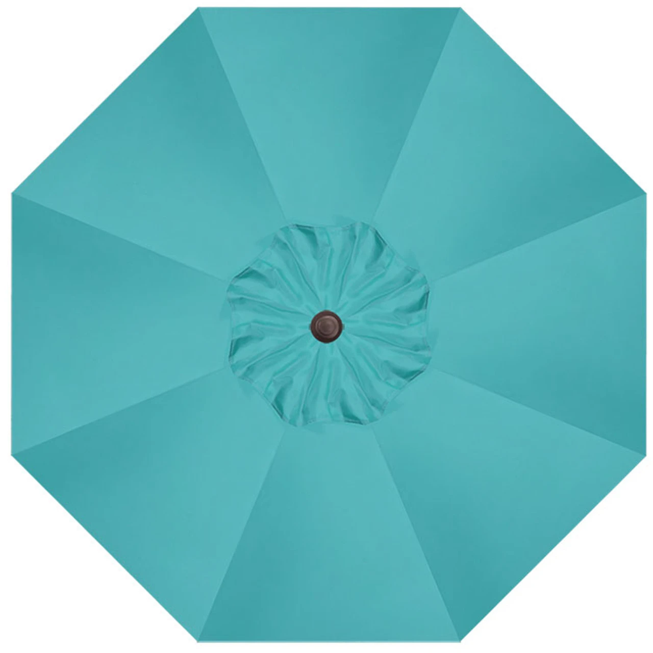 This 9′ market Umbrella brings plenty of style and shade to your Patio! The Bronze Aluminum frame and Aqua canopy look great in the sun and are a perfect match to Leaders Patio Furniture. These umbrellas crank open and closed and have a push button to tilt the canopy allowing you to maximize the shade.