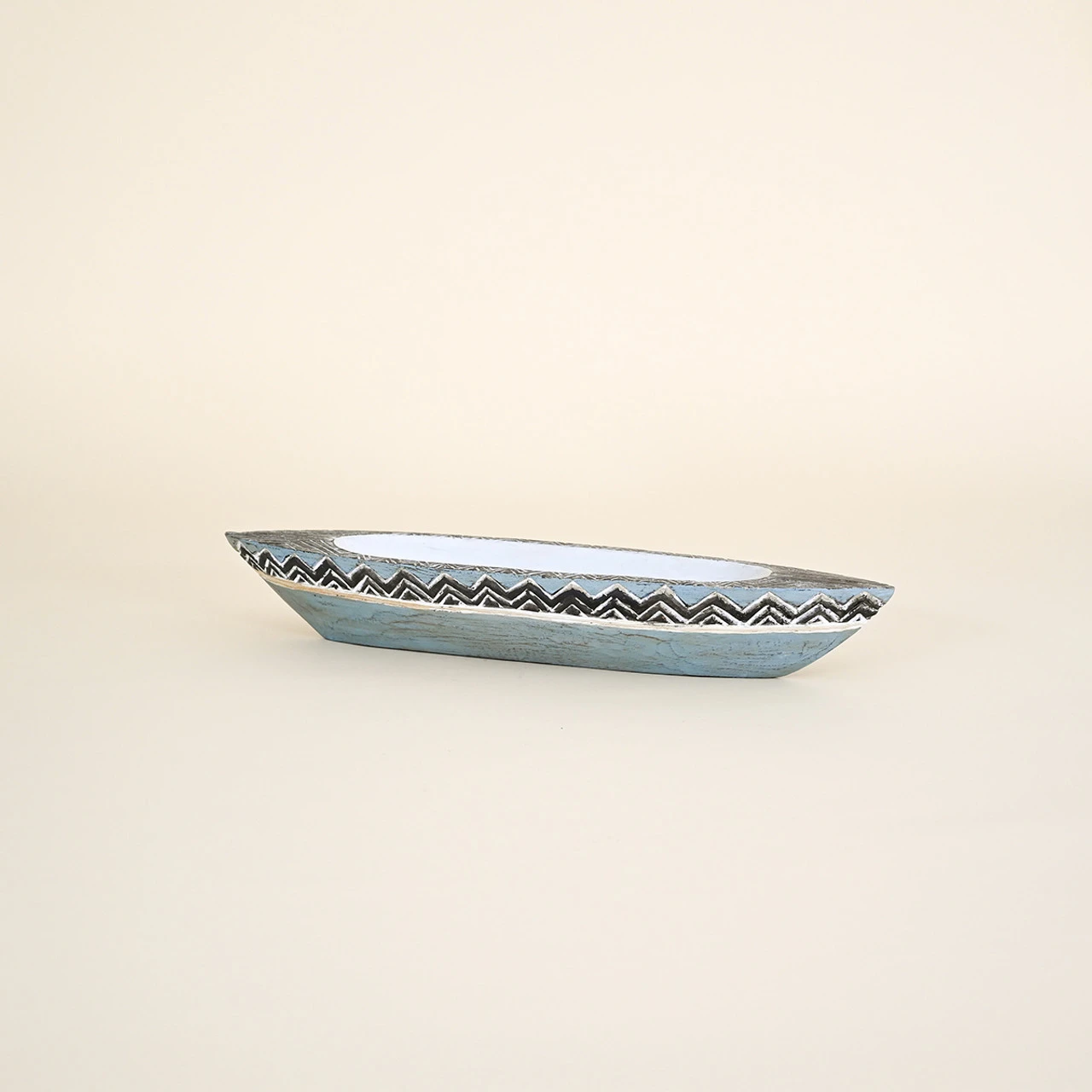 This hand-carved wooden boat dish in blue and white adds style and a touch of the islands to your space.