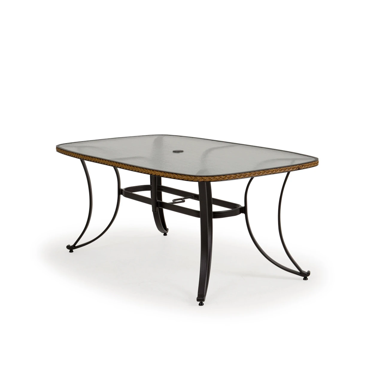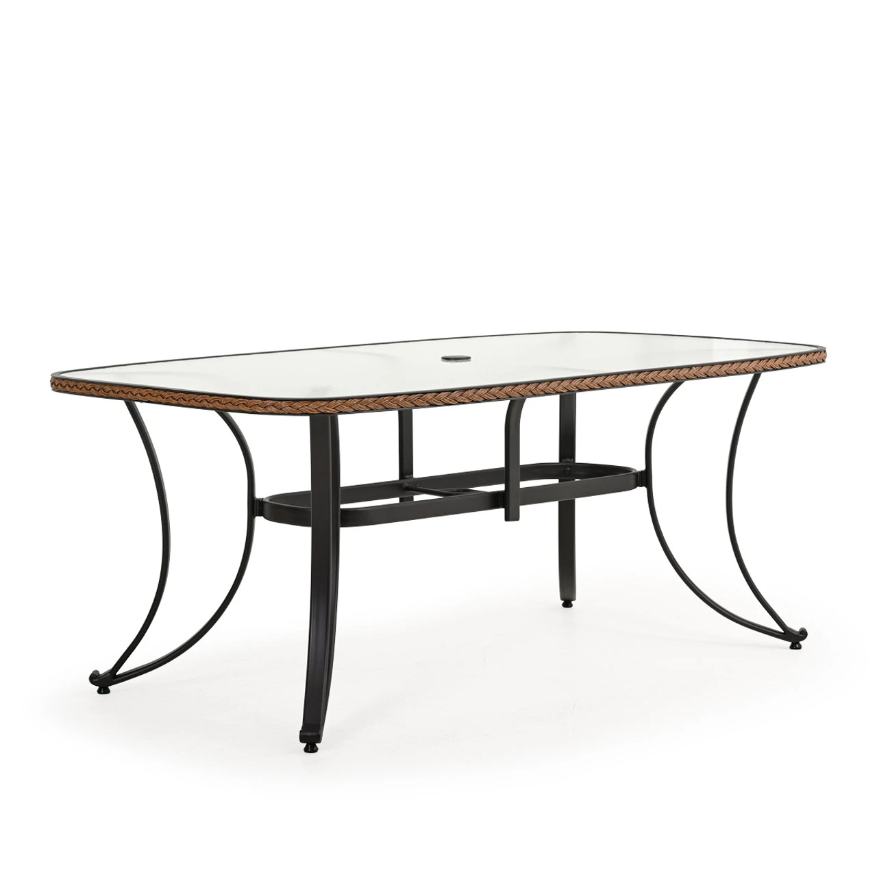 The Empire Outdoor Wicker Boat Shaped Table is made with an aluminum frame with a resin wicker weave trim and glass top.