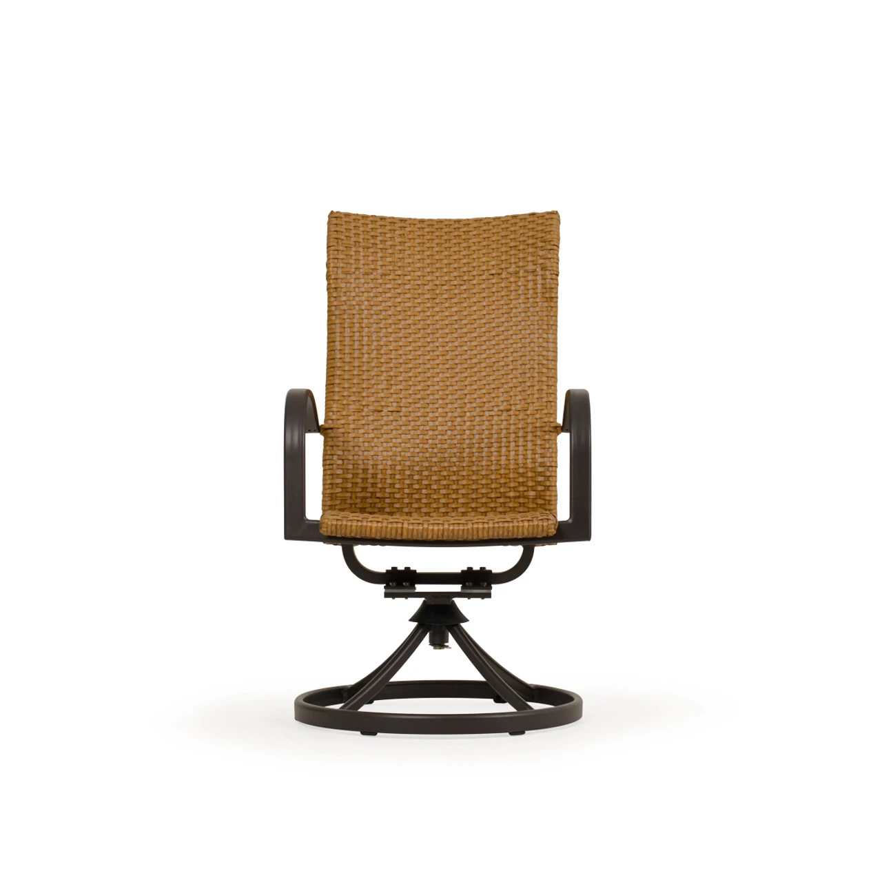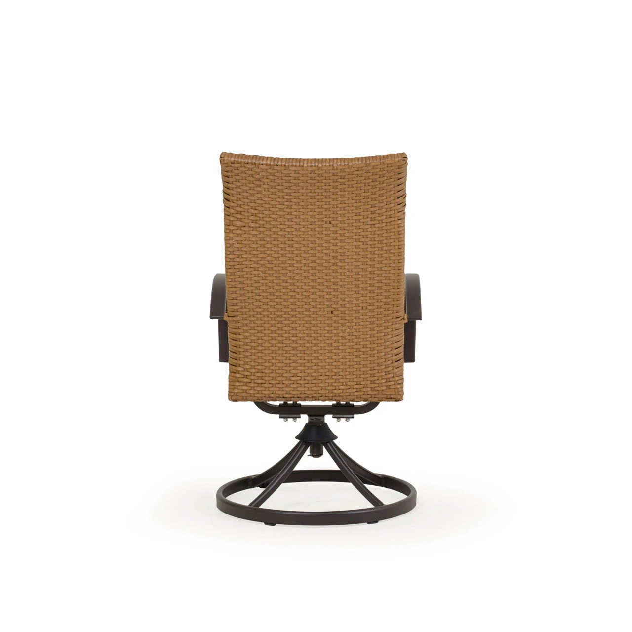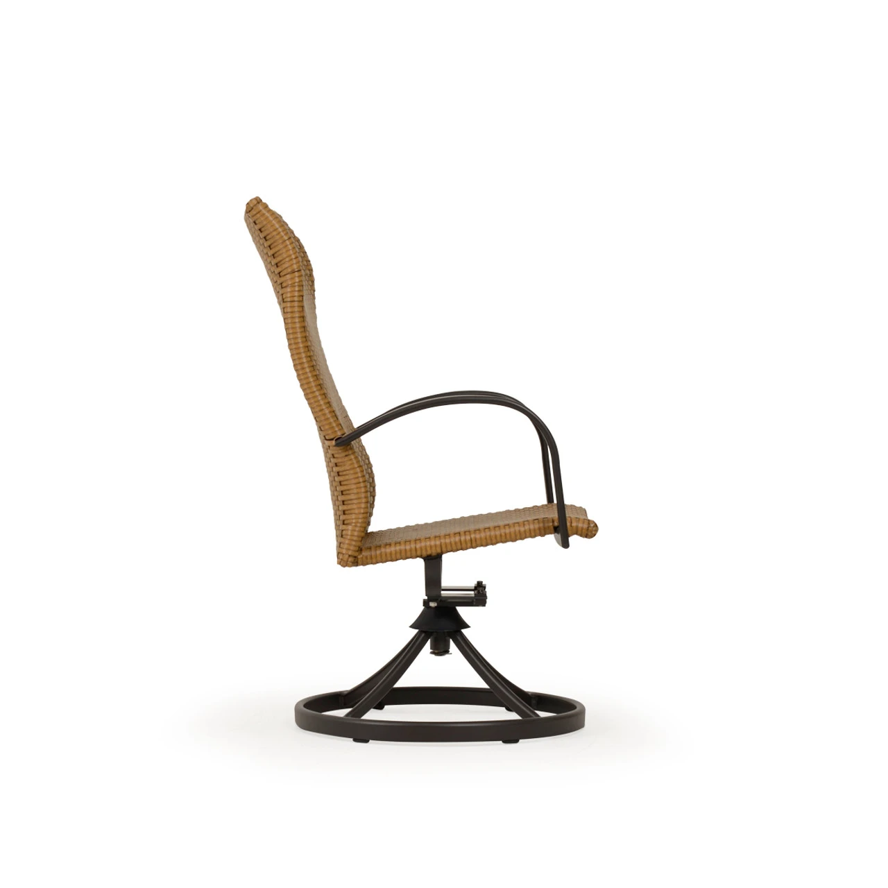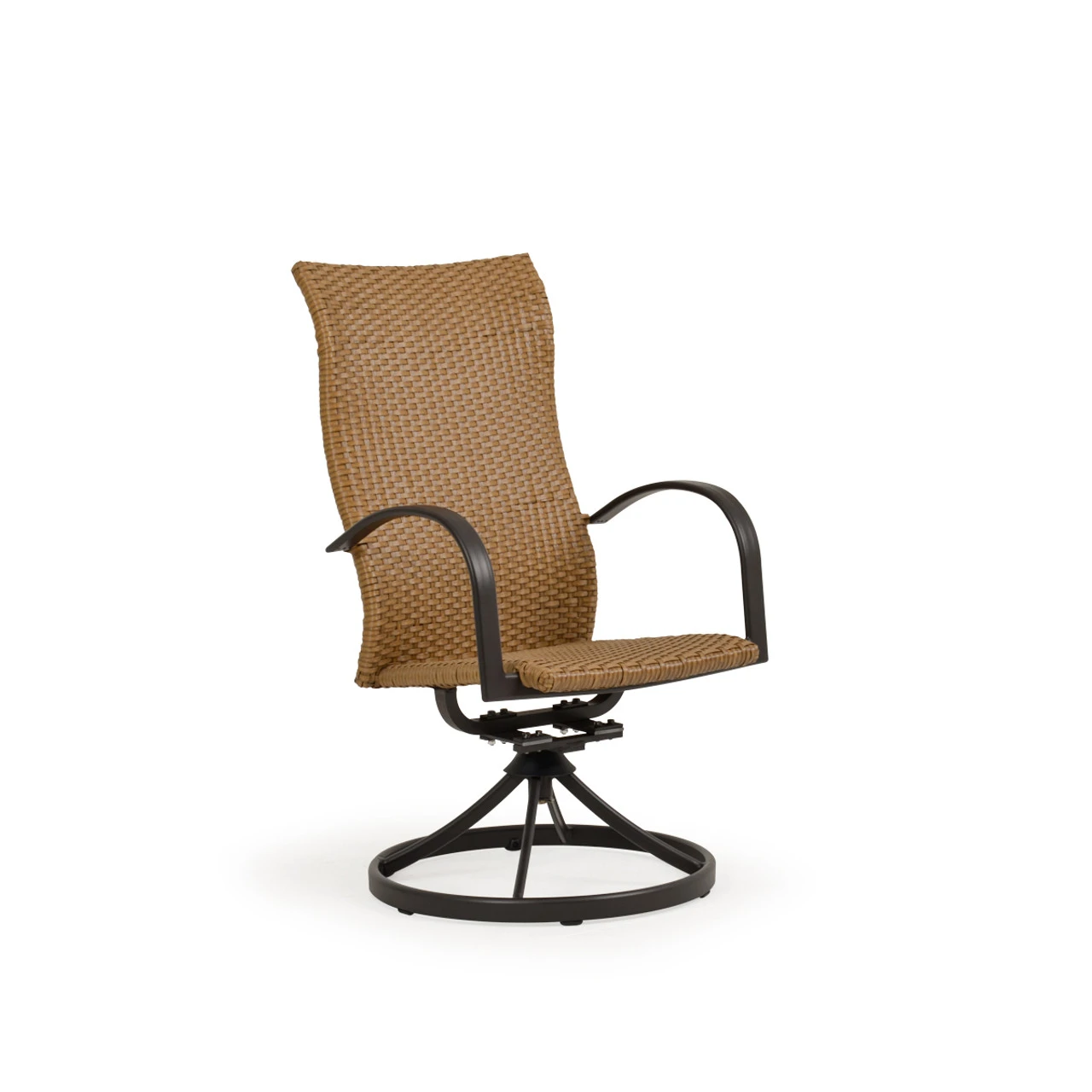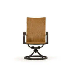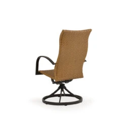 The Empire Outdoor Wicker High Back Swivel Tilt Dining Chair has a contemporary style that’s designed for comfort. The dining chair is made with all aluminum frames that are dressed in a resin wicker weave with curved backs for lumbar support.