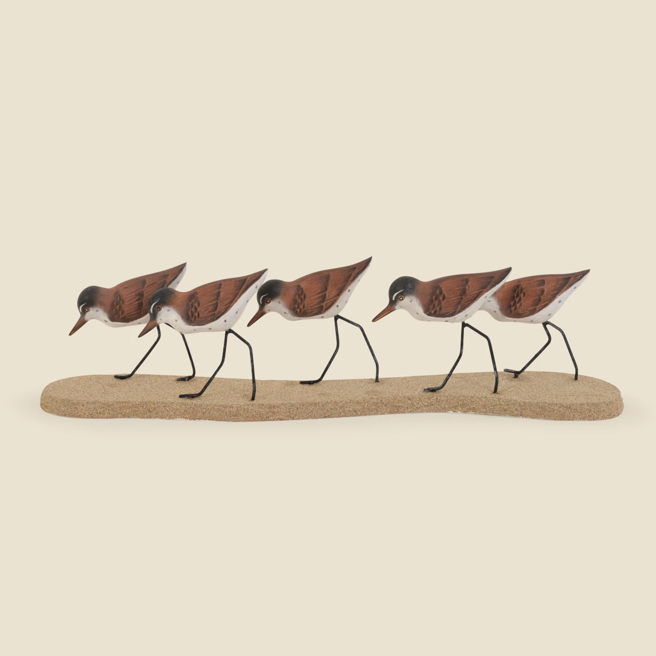 Sandpipers, Gotta Run! Five wooden hand carved sandpipers scurry across a wood base of faux sand on their spindly legs. Add some beach to your home.