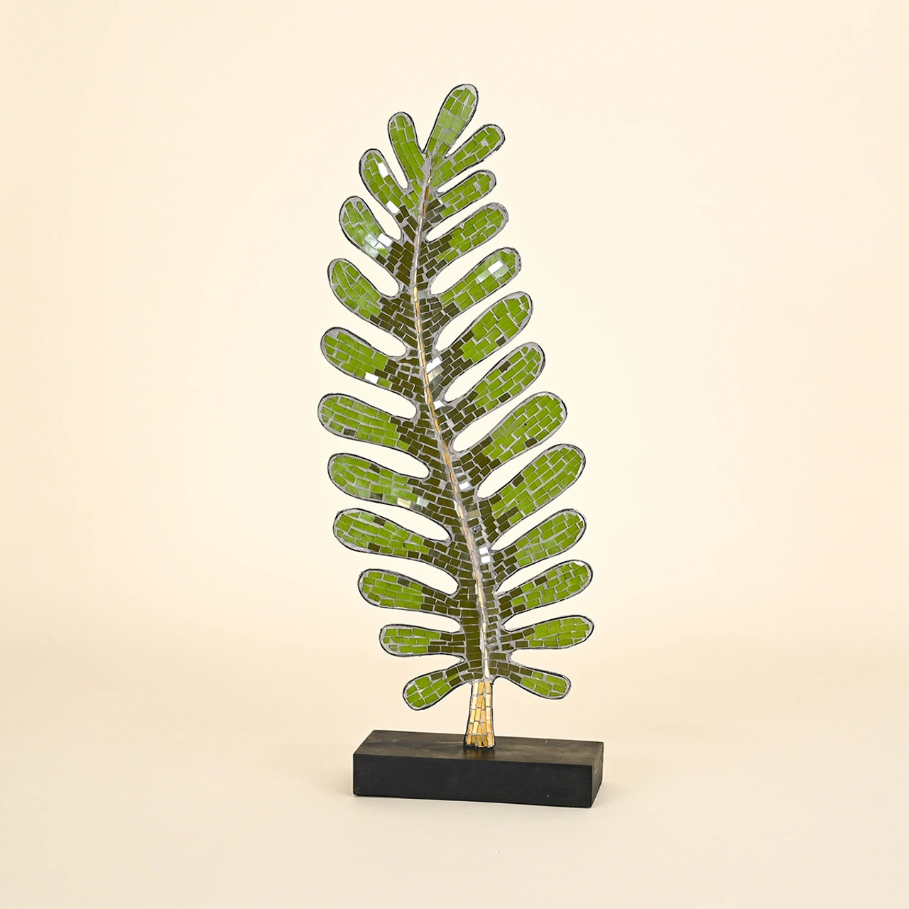 Carved by hand, this leaf with mosaic tiles on stand adds tropic style to your space.