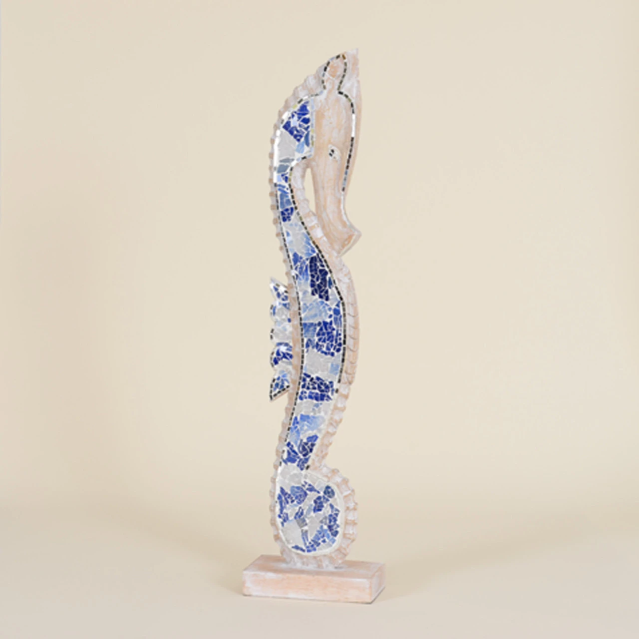 The Indoor Small Wooden Seahorse With Blue & White Mosaic Design is stunning. Add this joyful piece to any space.