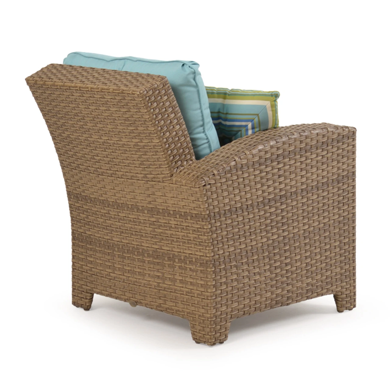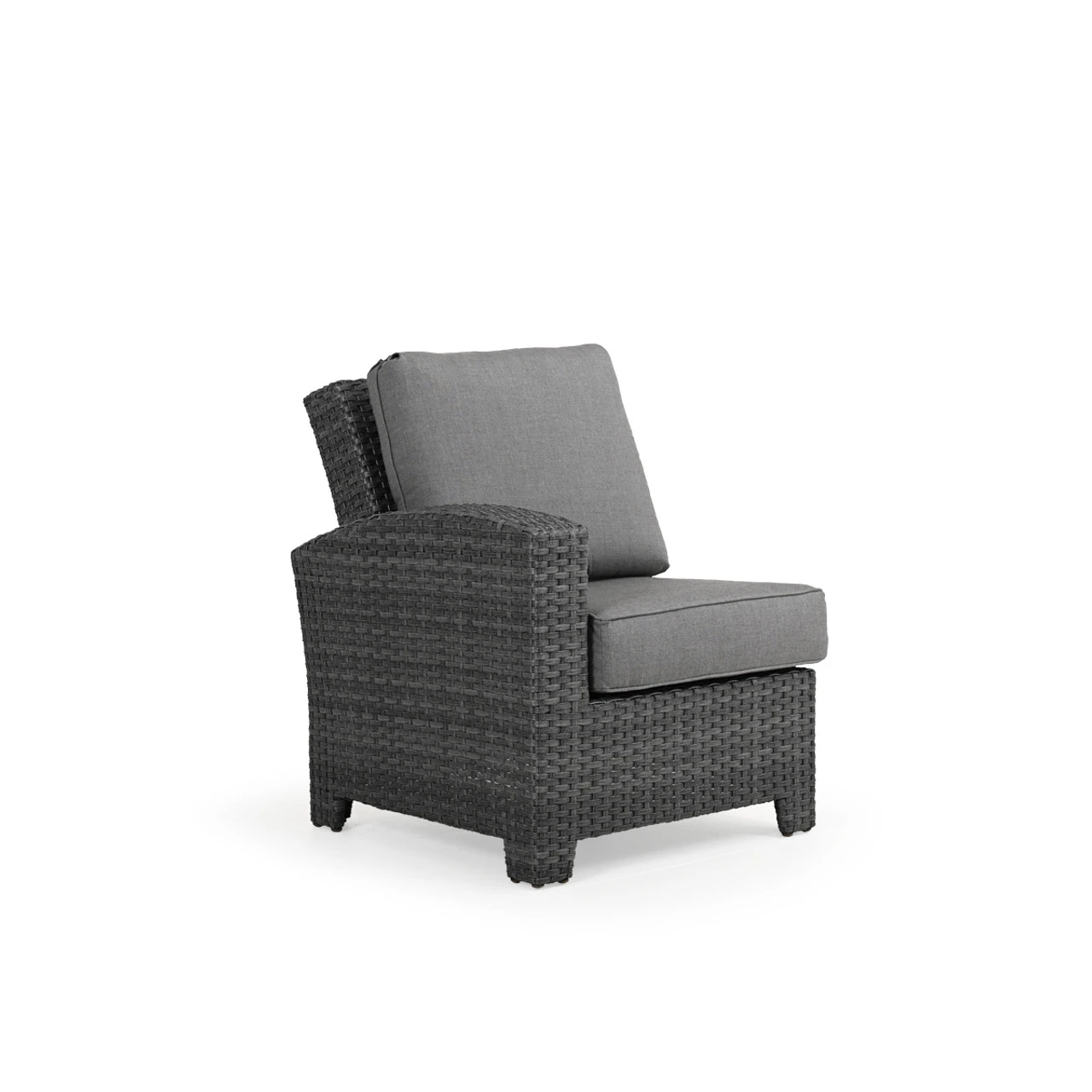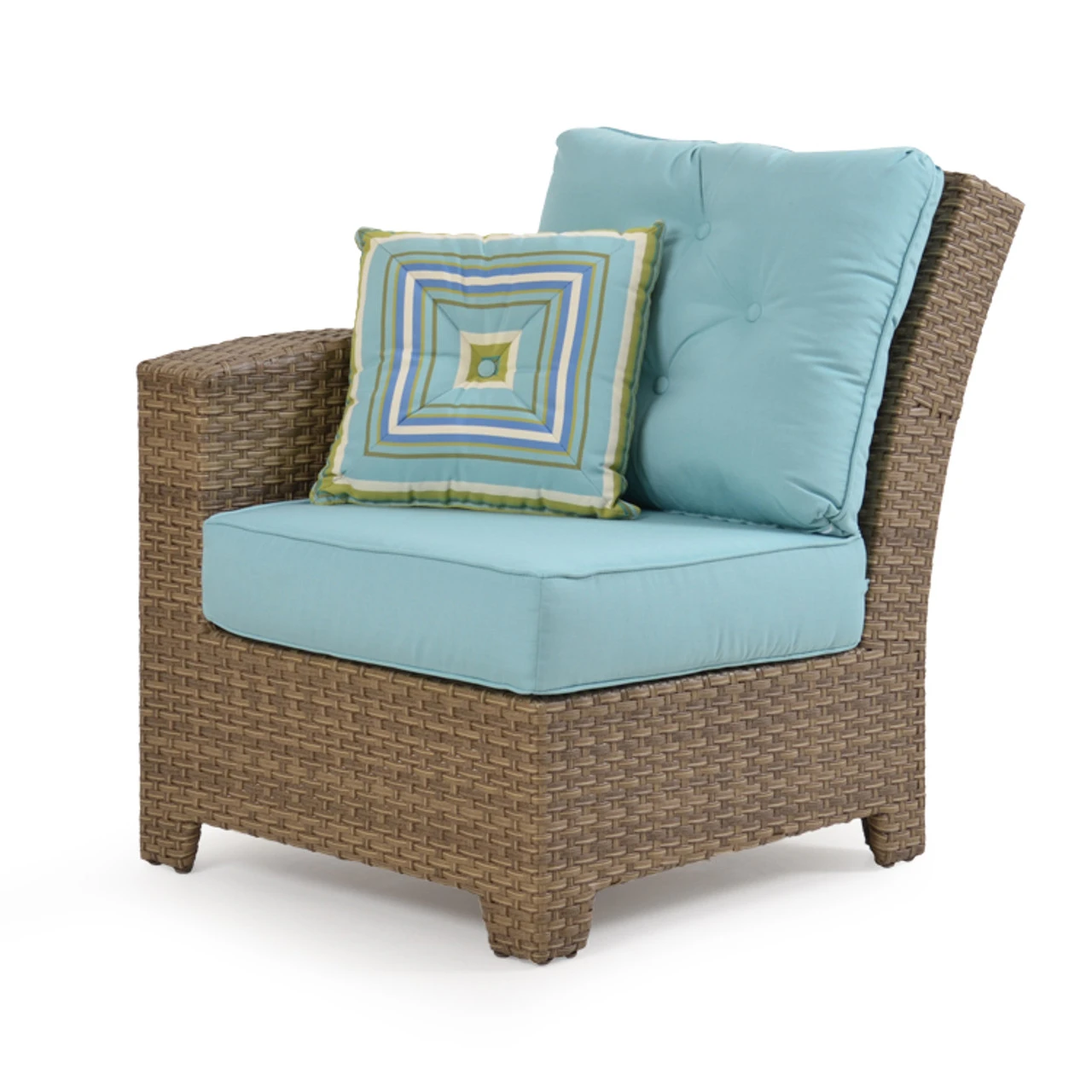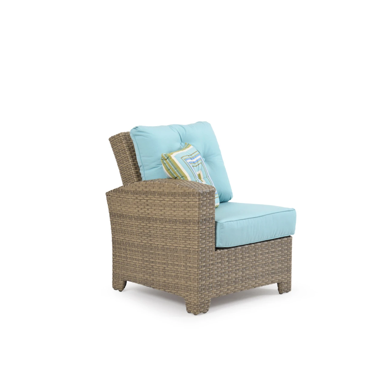 Our Kokomo Outdoor Wicker Left Facing Arm Chair has a gracefully curved back & tailored cushioning that create a timeless design with incredible comfort. These modular pieces attach at the bottom so that you can create the perfect fit for your space! Woven by hand over all aluminum frames, the extremely strong synthetic wicker strands are engineered for maximum durability. The Toss Pillows shown are optional and sold separately.
