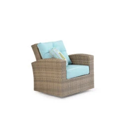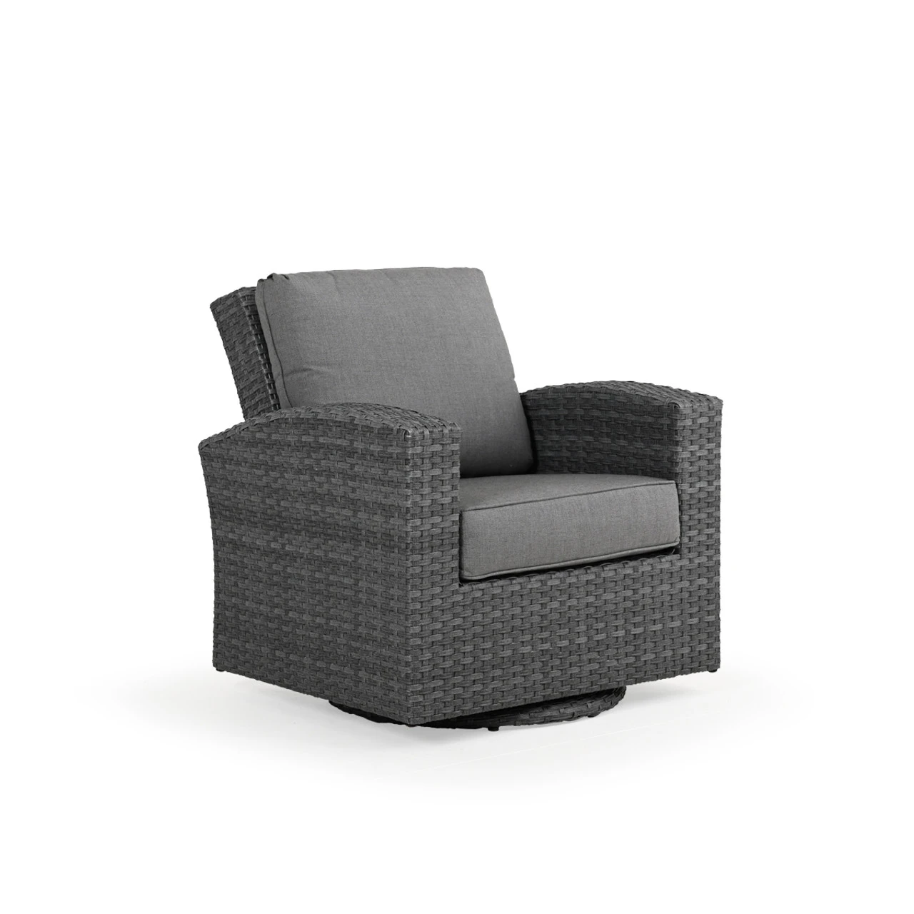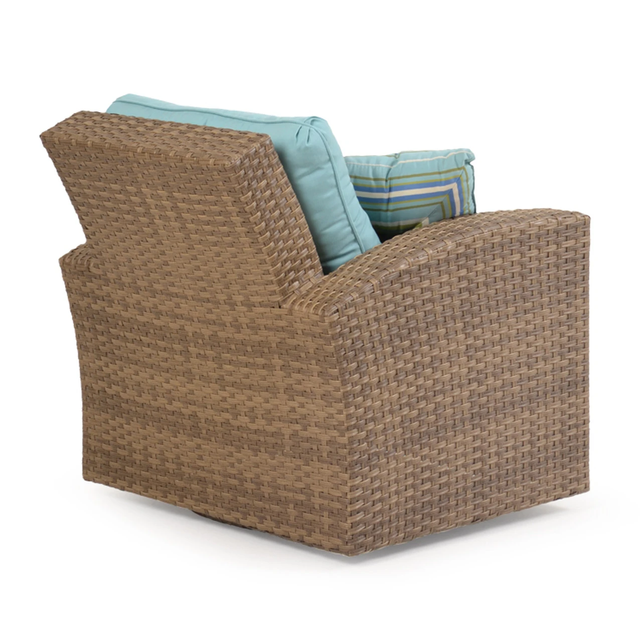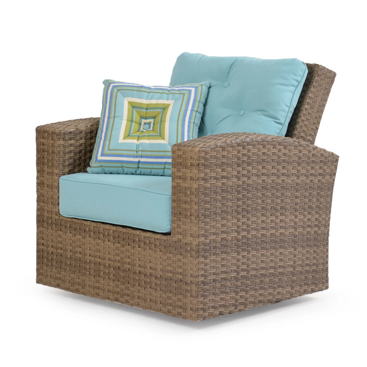 The Kokomo Wicker Swivel Glider Chair has a gracefully curved back tailored cushioning that create a timeless design with incredible comfort and the addition of motion. Woven by hand over all aluminum frames, the extremely strong synthetic wicker strands are engineered for maximum durability. Elegance, Durability and Ultimate Style all wrapped up into one dynamic collection! Have fun with all the fabrics that Leaders offers to make your patio truly special. The Toss Pillows shown are optional and sold separately.