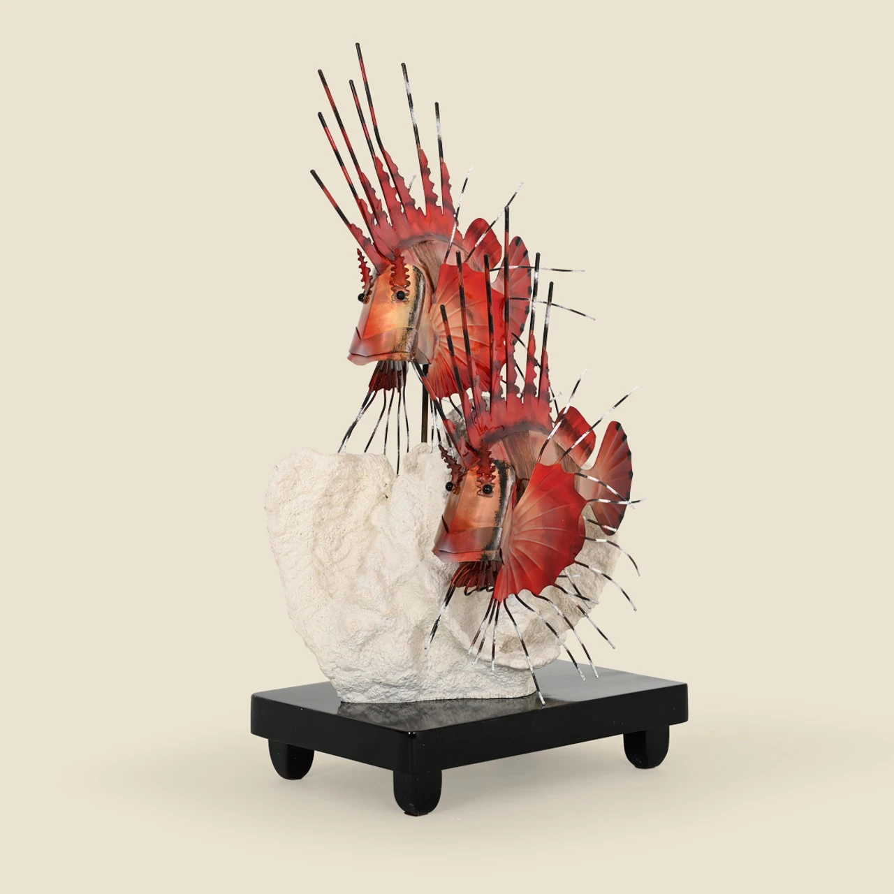 Lion Fish Table Sculpture, on Mahogany Base. Faux Lettuce Coral on stand. 8″x6″x17″ . Dangerous and Beautiful, two lion fish float gracefully among the lettuce coral. These fish are spectacularly crafted with vibrant colors and set on a Mahogany base.