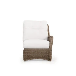 Maldives Outdoor Wicker Right Facing Arm Chair is a great modular piece that allows you to control how you want your furniture paired. This twisted synthetic weave is often mistaken for natural materials because of its color & richness. Use the modular sectional pieces to find the best fit for your space. Any Toss Pillows shown are optional and sold separately.