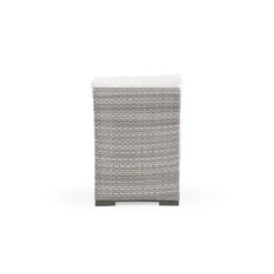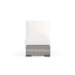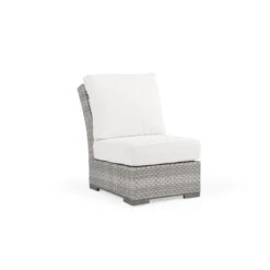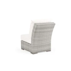 Generous size, matched with the incredible comfort of our handcrafted USA made cushions make this collection a RETREAT. The all‐weather wicker is hand woven over aluminum frames that will not rust and each piece is finished with PoliSoul™ arms and feet. This Armless Chair fits nicely to extend you sectional.