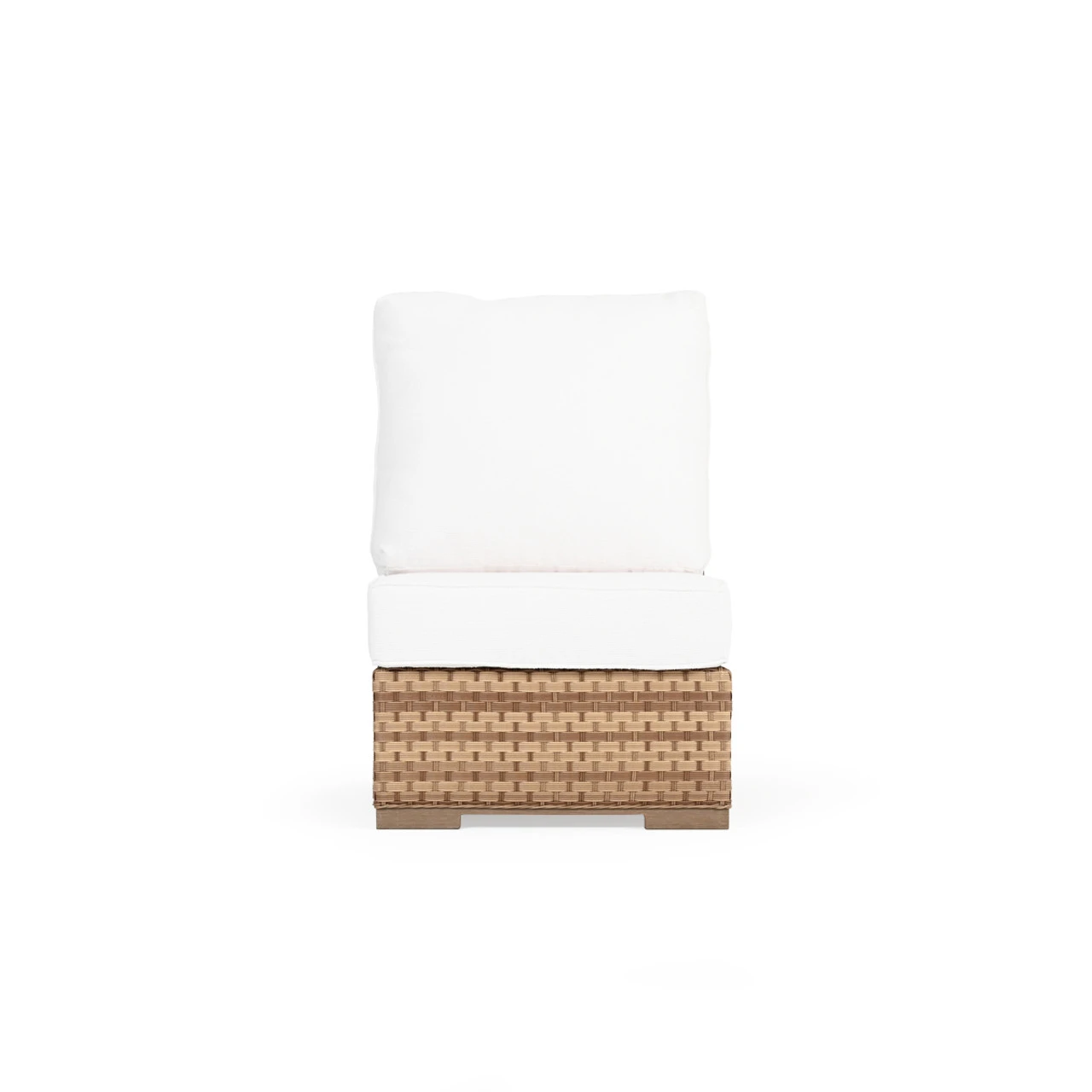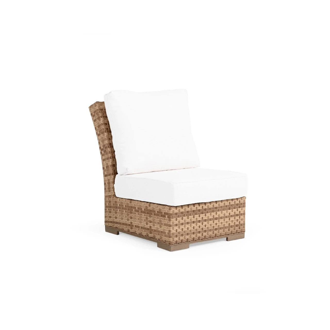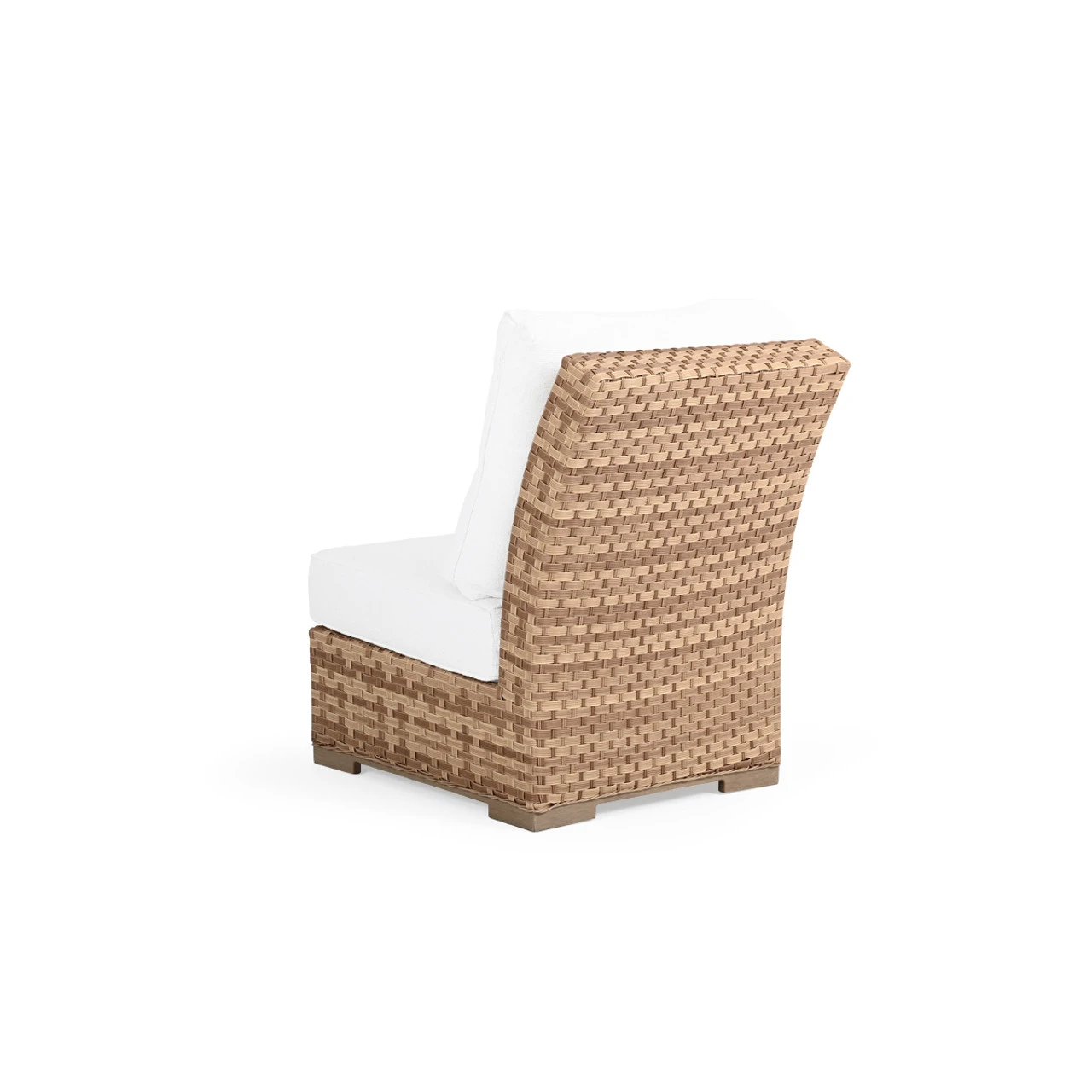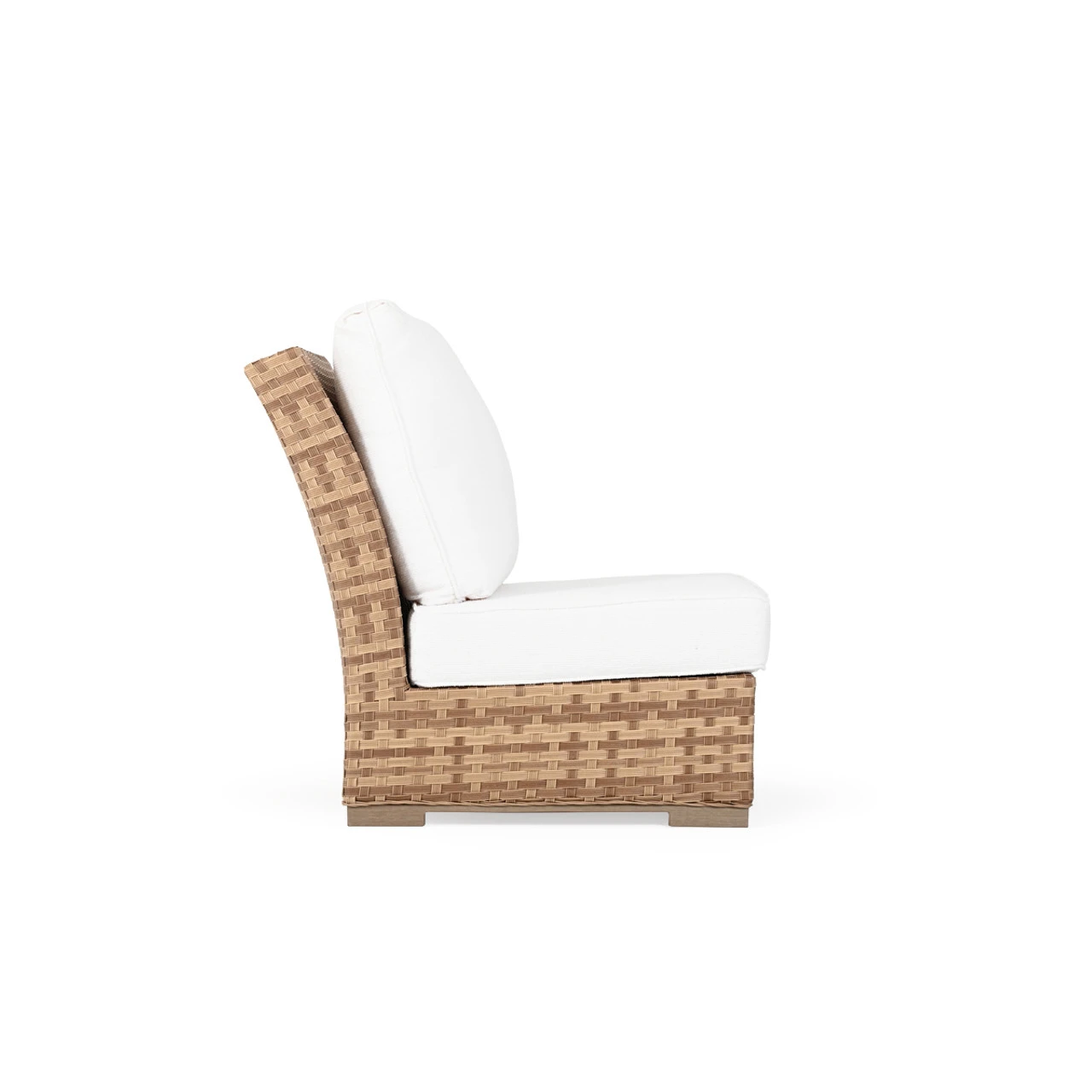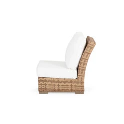 Generous size, matched with the incredible comfort of our handcrafted USA made cushions make this collection a RETREAT. The all‐weather wicker is hand woven over aluminum frames that will not rust and each piece is finished with PoliSoul™ arms and feet. This Armless Chair fits nicely to extend you sectional.