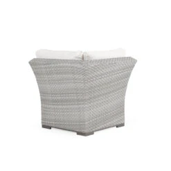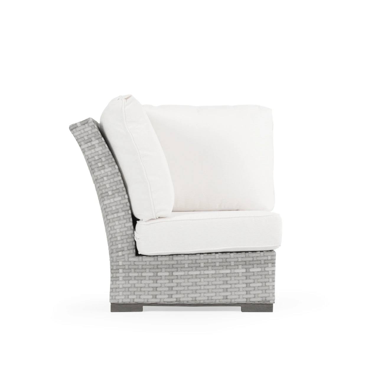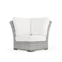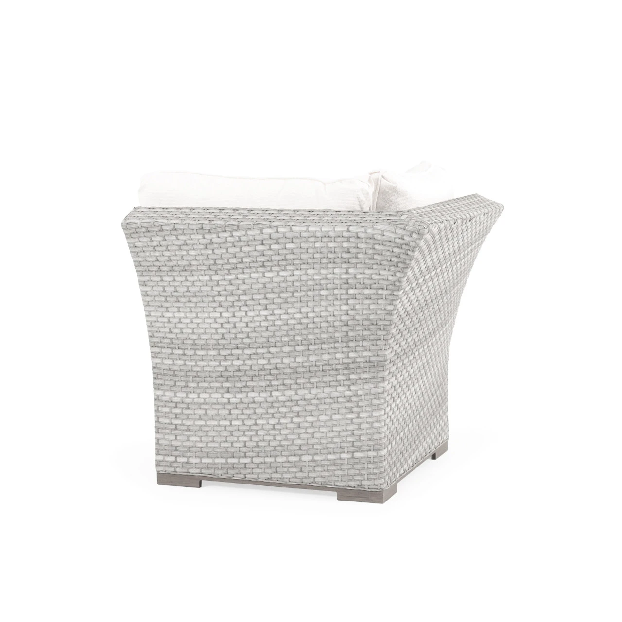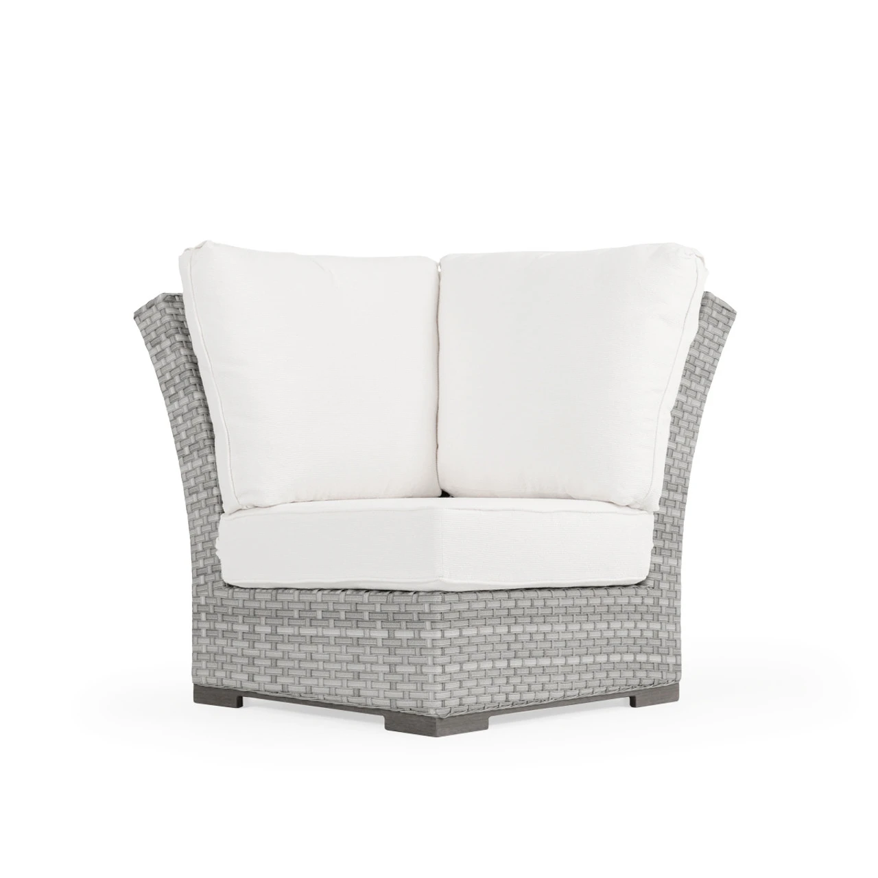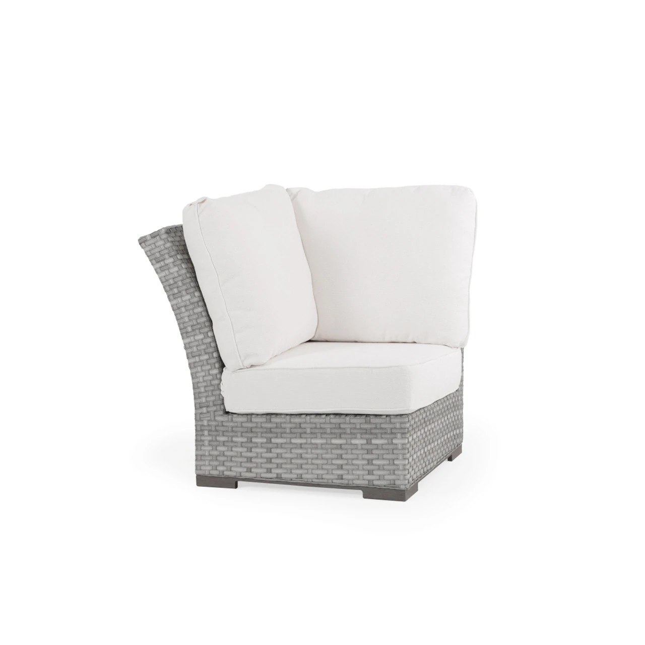 Generous size, matched with the incredible comfort of our handcrafted USA made cushions make this collection a retreat. The all‐weather wicker is hand woven over aluminum frames that will not rust and each piece is finished with PoliSoul™ arms and feet. This Corner Wedge Chair makes a 90° corner for sectional.
