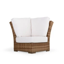 Generous size, matched with the incredible comfort of our handcrafted USA made cushions make this collection a retreat. The all‐weather wicker is hand woven over aluminum frames that will not rust and each piece is finished with PoliSoul™ arms and feet. This Corner Wedge Chair makes a 90° corner for sectional.