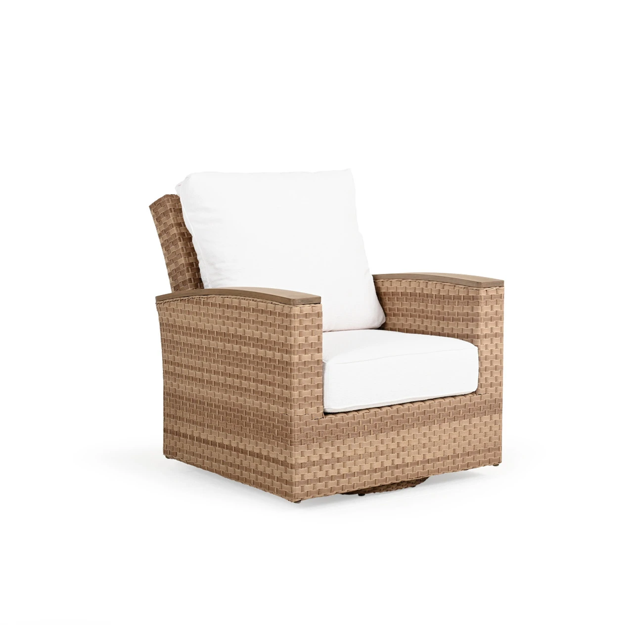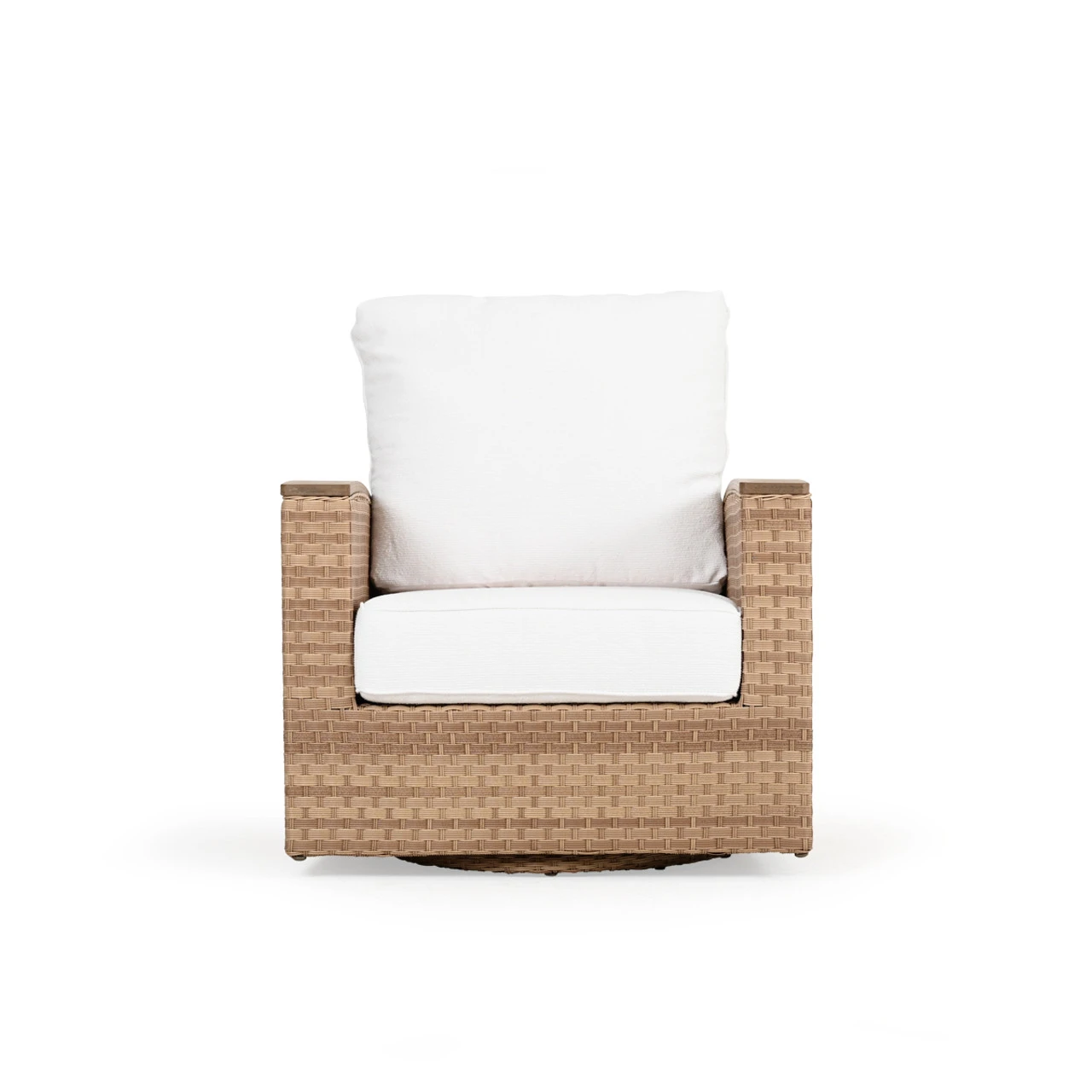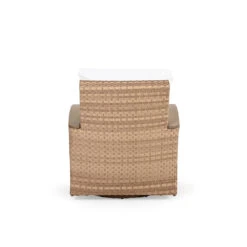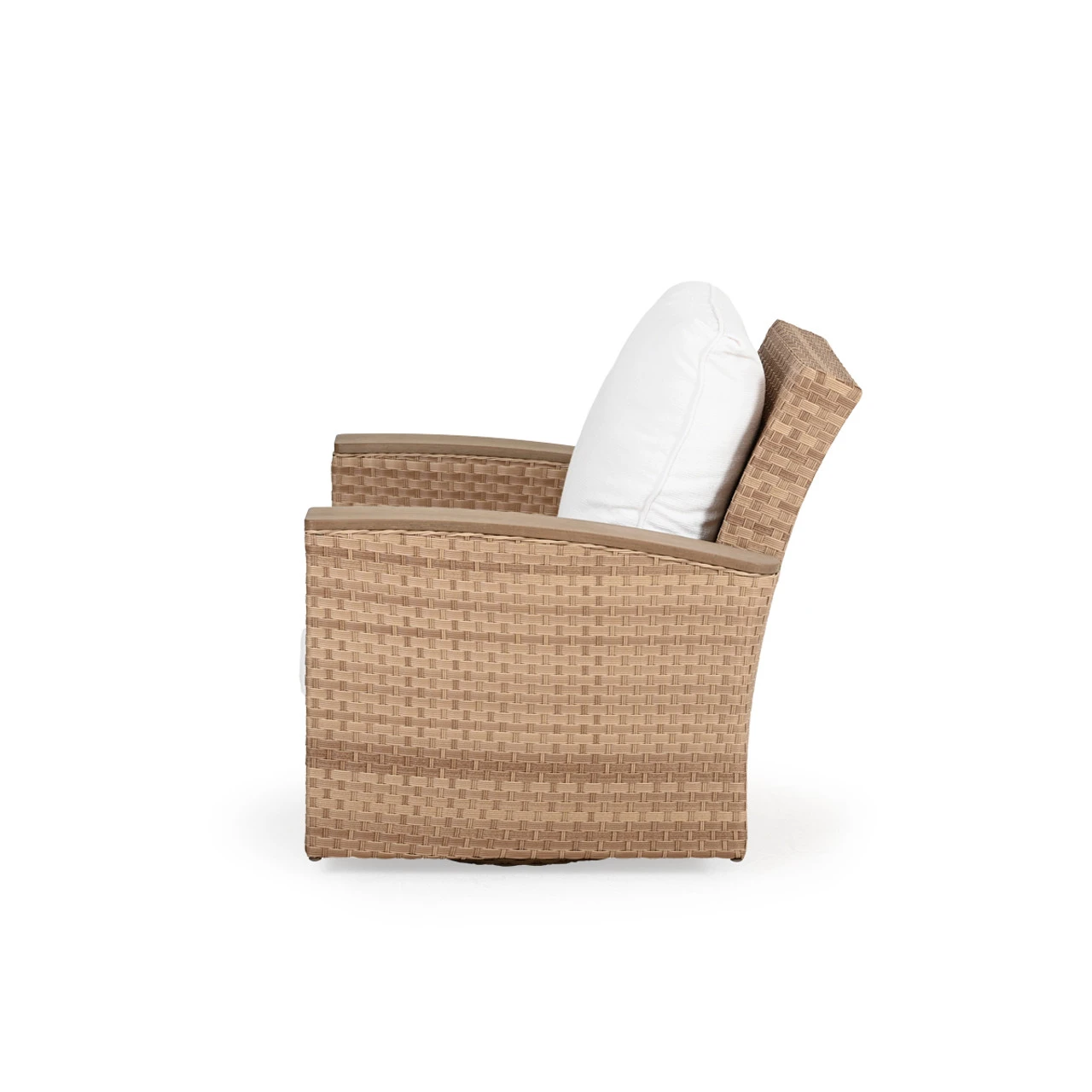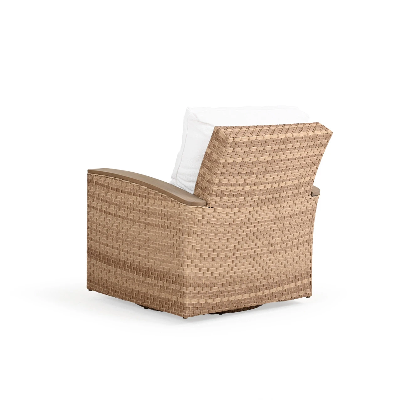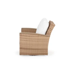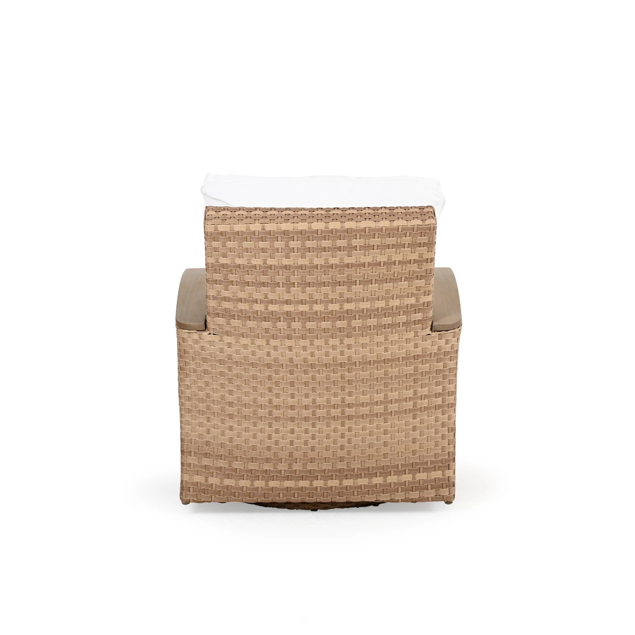 Generous size, matched with the incredible comfort of our handcrafted USA made cushions make this collection a retreat with the additional comfort of motion. The all‐weather wicker is hand woven over aluminum frames that will not rust and each piece is finished with PoliSoul™ arms.