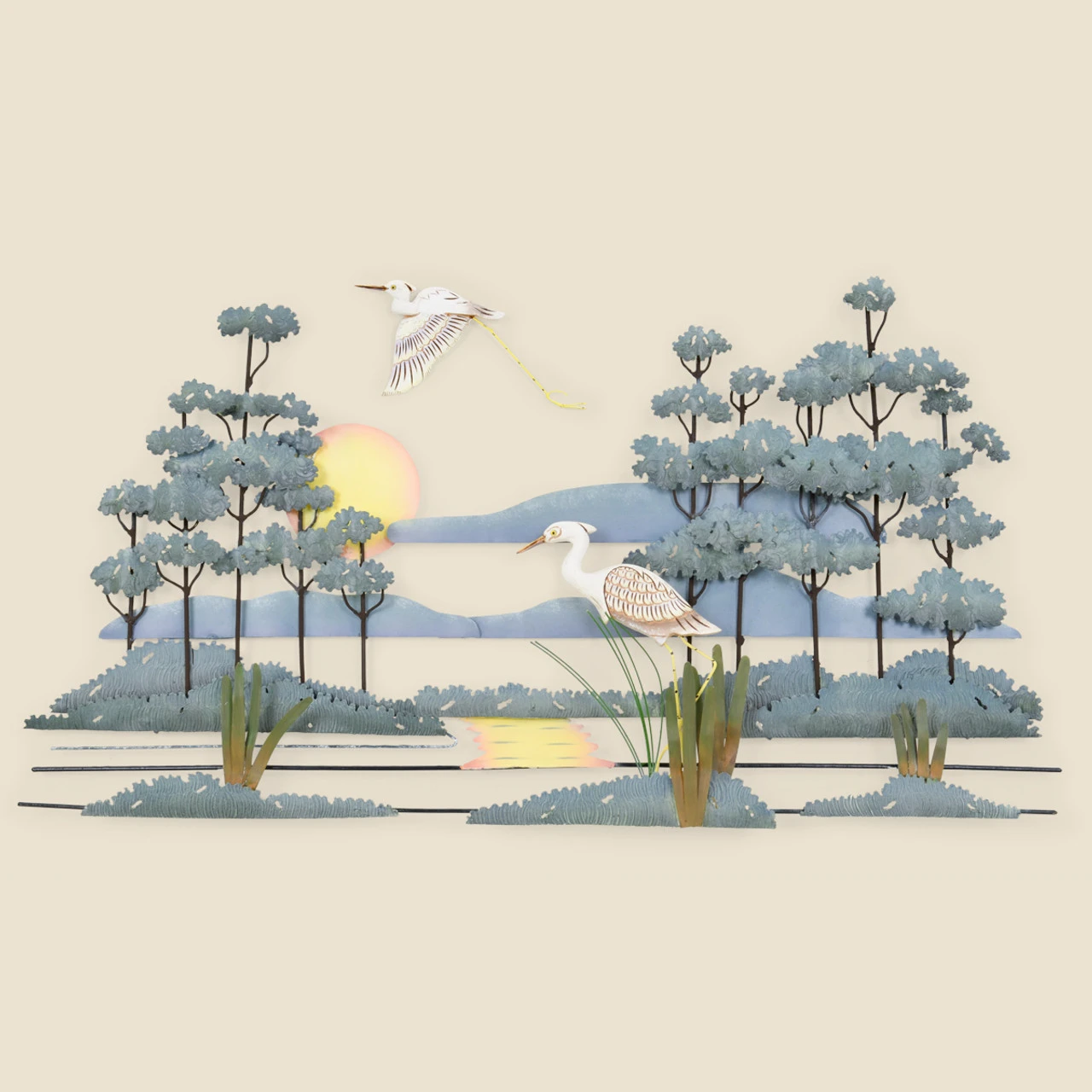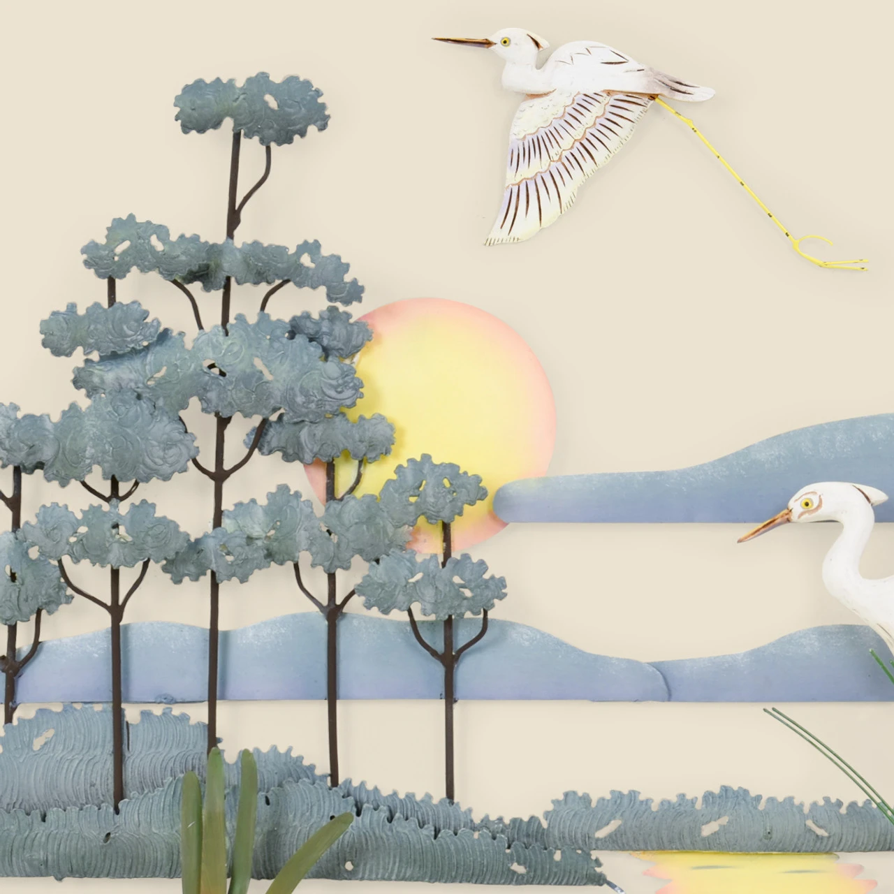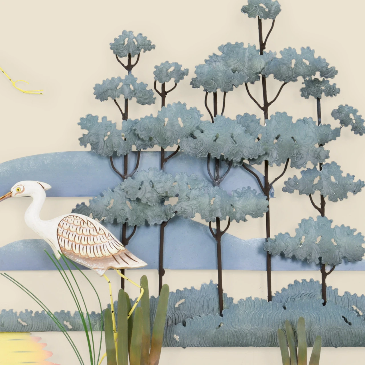Richly crafted 3 Dimensional savannah with wooden bird on a metal sculpture. Hand carved wooden bird with metal trees, clouds and sun, all hand painted. Extra flying bird above the scene is also hand carved