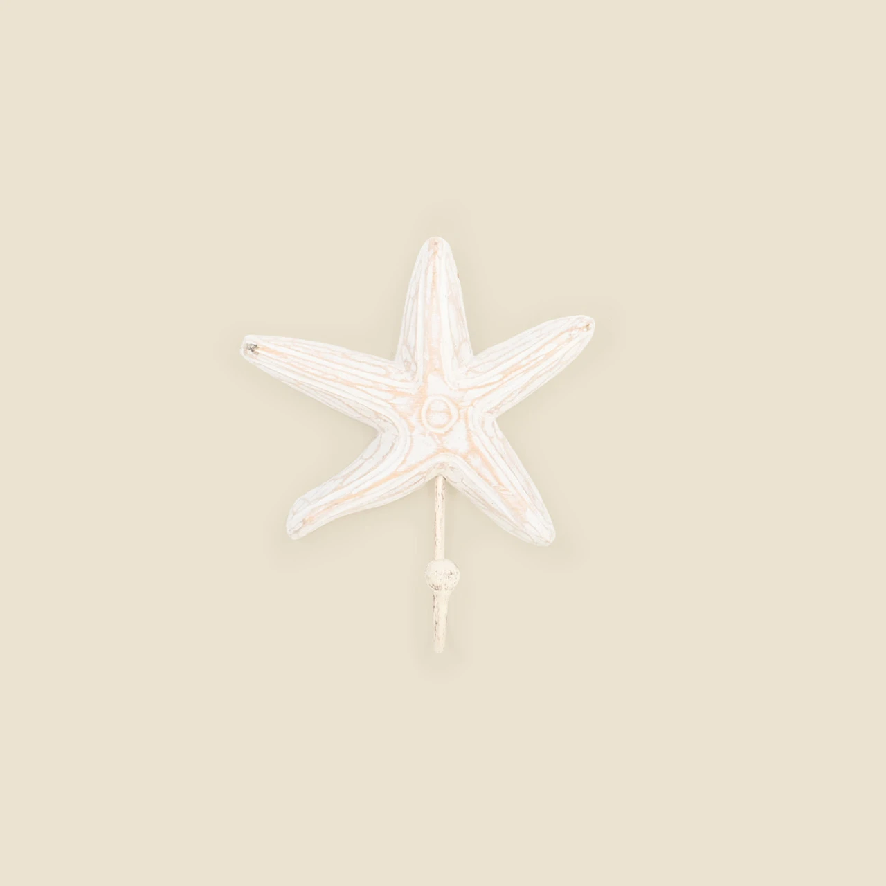 Hand carved wooden starfish mounted on metal frame with single hook for hanging.