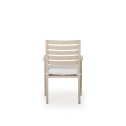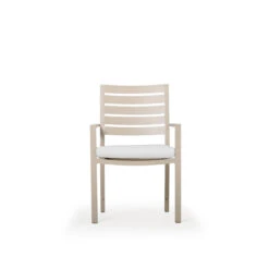 The Somerset Dining Arm Chair has a modern silhouette with clean lines and a slatted back. Rust proof aluminum frames are powder-coated for durability while also adding texture. A sturdy yet comfortable cushion available in over 100 fabrics completes the look and design of this stackable chair.