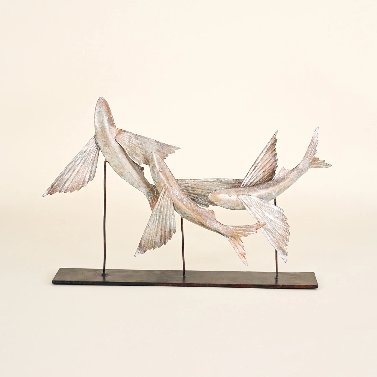 These hand-crafted metal flying fish on a black stand bring the ocean into your space.
