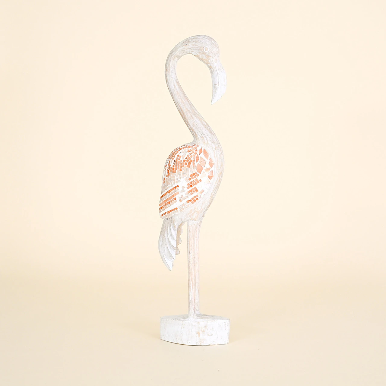 This hand-crafted wooden flamingo has white and coral colored mosaics to sprinkle a little sparkle in any room.