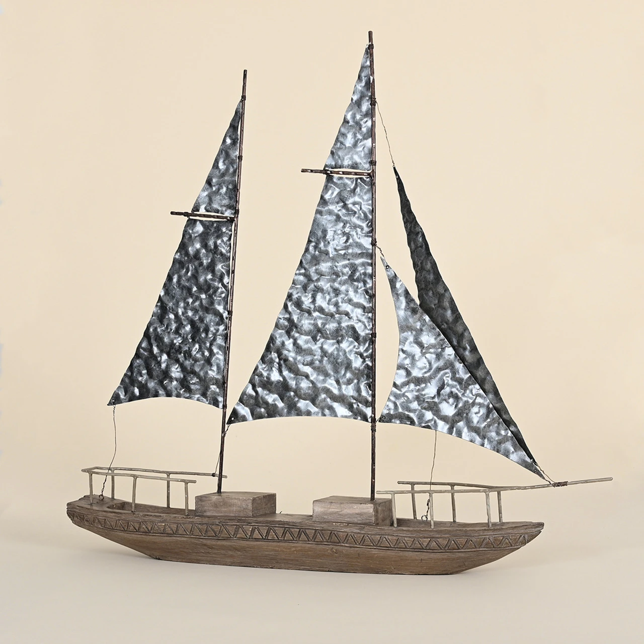 Finish your nautical theme by adding this Wooden Sailboat with Metal Sails. Big enough to fit on cocktail or dining tables.